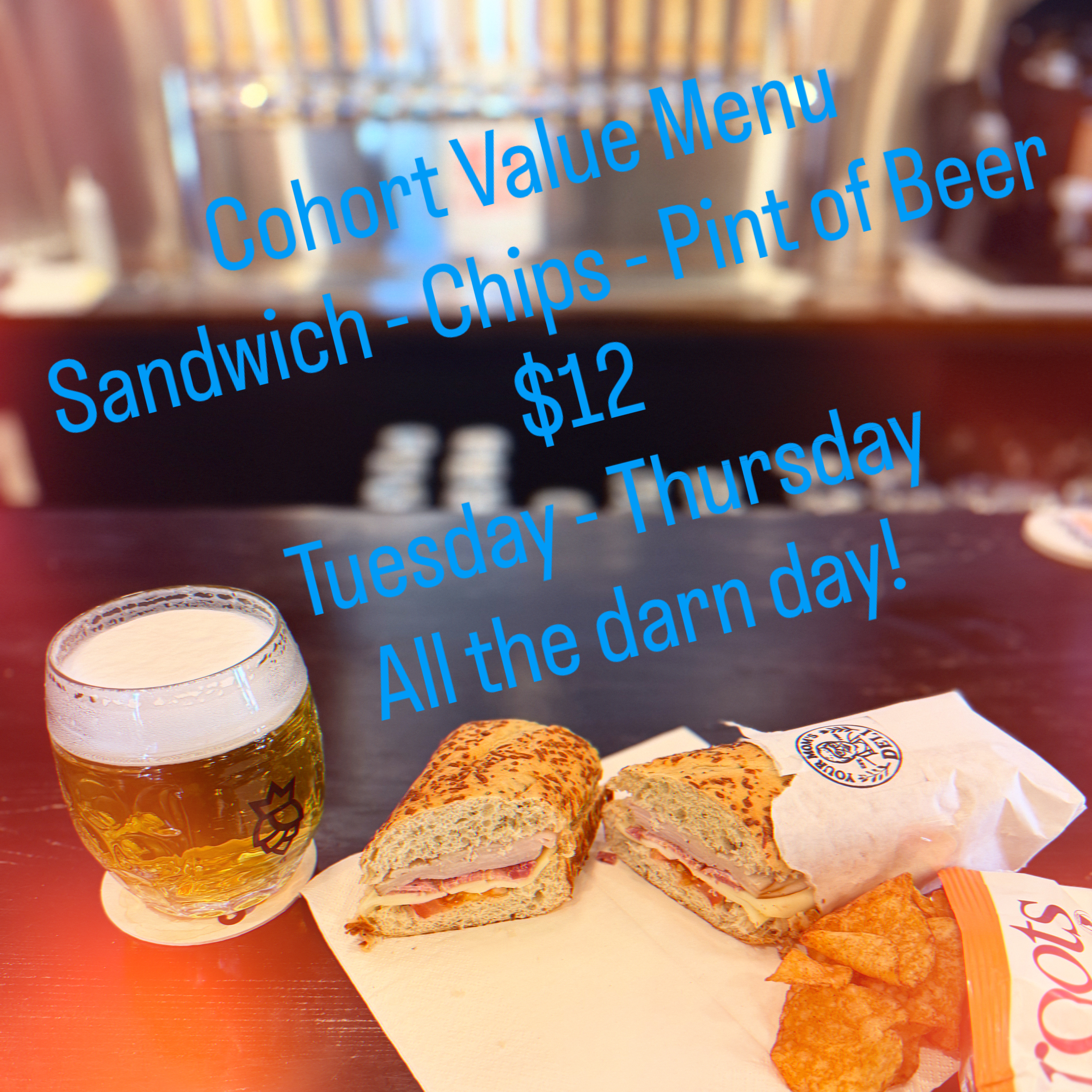 Every Tuesday – Thursday at Cohort Black Hills, enjoy a Mom’s Deli sandwich, chips, and a pint of beer for ONLY 12 smackers. Available all…darn…day!